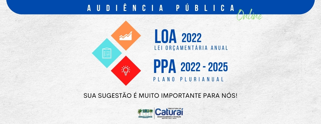 Convocamos a todos para AUDIÊNCIA PÚBLICA sobre elaboração da LOA para 2022 (Lei Orçamentária Anual) e do PPA 2012/2025 (Plano Plurianual) que será realizado no dia 25/08/2021 a partir das 15:00 horas no prédio da Prefeitura Municipal de Caturaí, inclusive com a participação do Ministério Público.