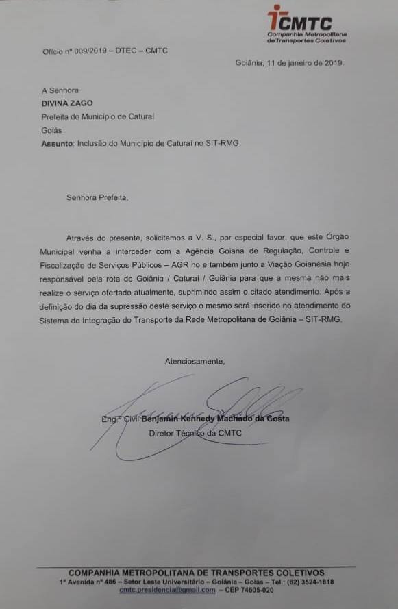 A Prefeitura de Caturaí juntamente com a Câmara Municipal de Caturaí e Companhia Metropolitana de Transporte Coletivo (CMTC) comunicam a toda população sobre a integração do município ao transporte coletivo metropolitano. O serviço terá inicio após o desligamento da rota Goiânia/Caturaí/Goiânia, hoje feita pela a empresa Goianésia.