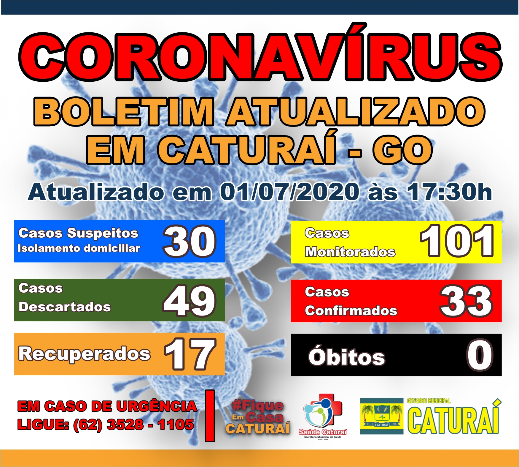 A Prefeitura de Caturaí, por meio da Secretaria Municipal de Saúde, informa que no município há 33 casos confirmados do novo Coronavírus (Covid-19), sendo que 17 já se encontram recuperados. A cidade também conta com 30 casos suspeitos, 101 pessoas em monitorados e 49 casos descartados. Informações atualizadas às 17:30, deste quarta-feira, 01 de julho.
