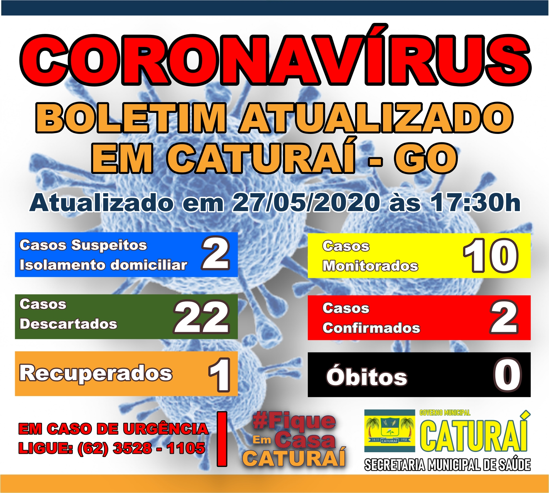 A Prefeitura de Caturaí, por meio da Secretaria Municipal de Saúde, informa que no município há 02 casos confirmado do novo Coronavírus (Covid-19), sendo 01 já se encontra recuperado. A cidade também conta com 02 casos suspeitos, 10 monitorados e 22 descartados. Informações atualizadas às 17:30, desta quarta-feira, 27 de maio.