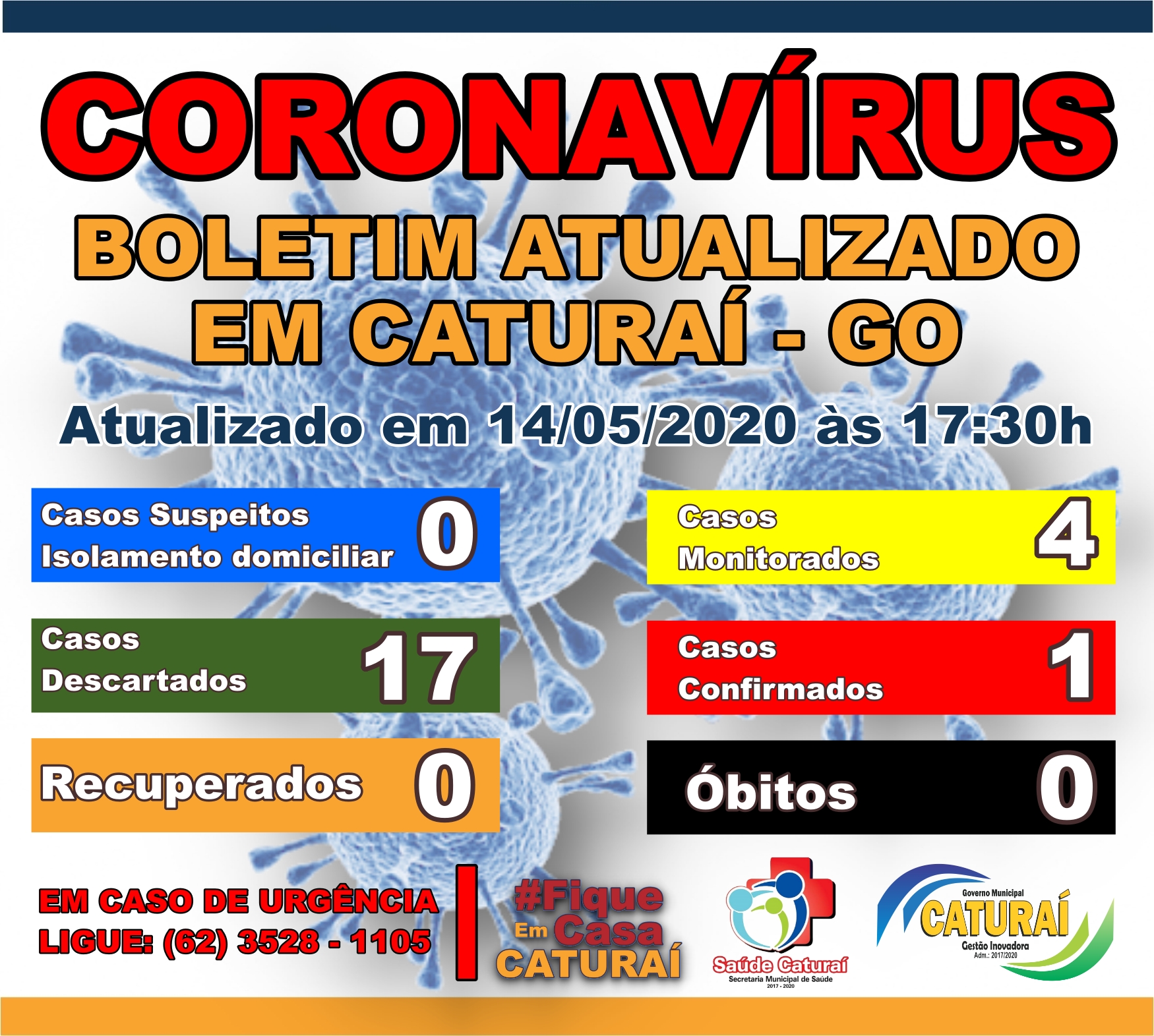 A Prefeitura de Caturaí, por meio da Secretaria Municipal de Saúde, informa que o município há 01 caso confirmado do novo Coronavírus (Covid-19). A cidade também conta com 4 casos monitorados, 17 descartados e nenhum suspeito. Informações atualizadas às 17:30, desta quinta-feira, 14 de maio. Todos os pacientes com suspeitas e confirmados, encontra-se em isolamento domiciliar.