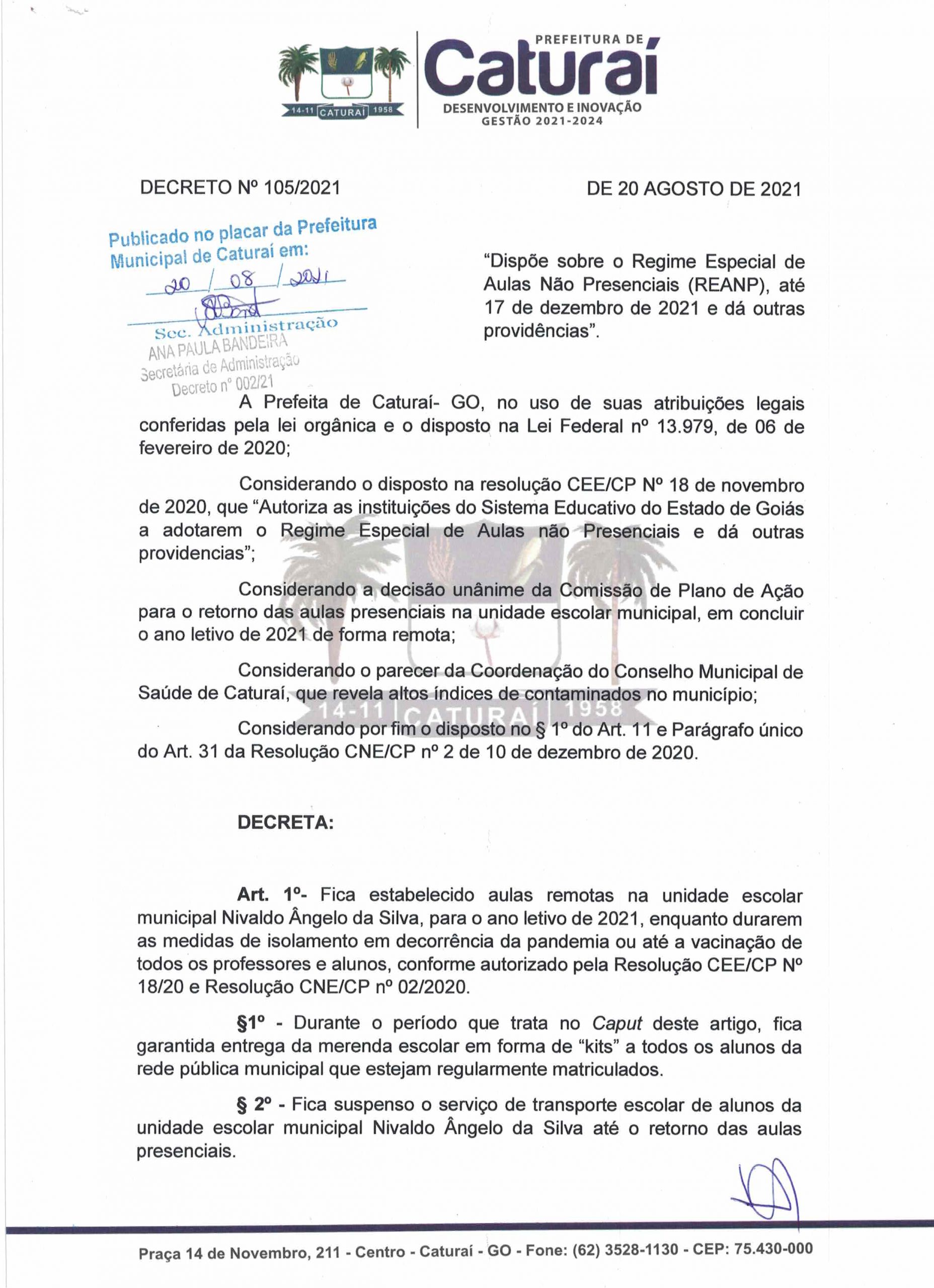 Conforme deliberação do Centro de Operações de Emergência (COE), Conselho Municipal de Saúde, Comissão de Plano de Ação e Secretaria Municipal de Educação, a Prefeitura de Caturaí publicou o Decreto Municipal nº 105/2021 de 20 de Agosto de 2021. O documento é baseado na Nota Técnica nº 007/2021, que orienta a continuação do Regime de Aulas Não Presenciais (REANP) na Rede Municipal de Ensino, até 17 de dezembro de 2021.