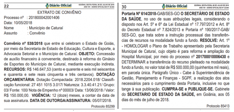 No mesmo dia, também foi publicado o Convênio nº 538/2018, que celebram o Estado de Goiás, por meio da Secretaria de Estado de Educação, Cultura e Esporte, a Advocacia Setorial e o Município de Caturaí a concessão de auxílio financeiro destinado à REFORMA DO GINÁSIO DE ESPORTE DE CATURAÍ, no valor de R$ 146.647,53 (cento e quarente e seis mil seiscentos e quarenta e sete reais cinquenta e três centavos).