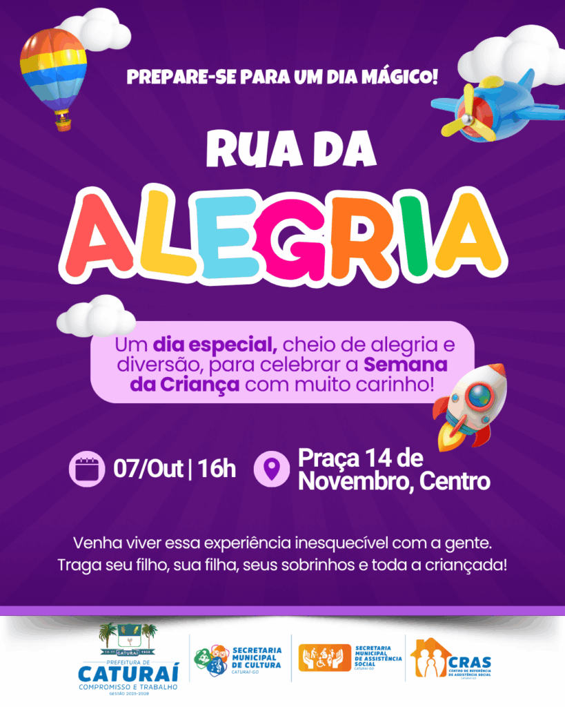 A Prefeitura de Caturaí preparou uma programação especial para celebrar a Semana da Criança com muita alegria e carinho. Na próxima terça-feira, dia 07 de outubro, a partir das 16h, será realizada a Rua da Alegria, na Praça 14 de Novembro, com entrada gratuita e atividades voltadas para o público infantil.