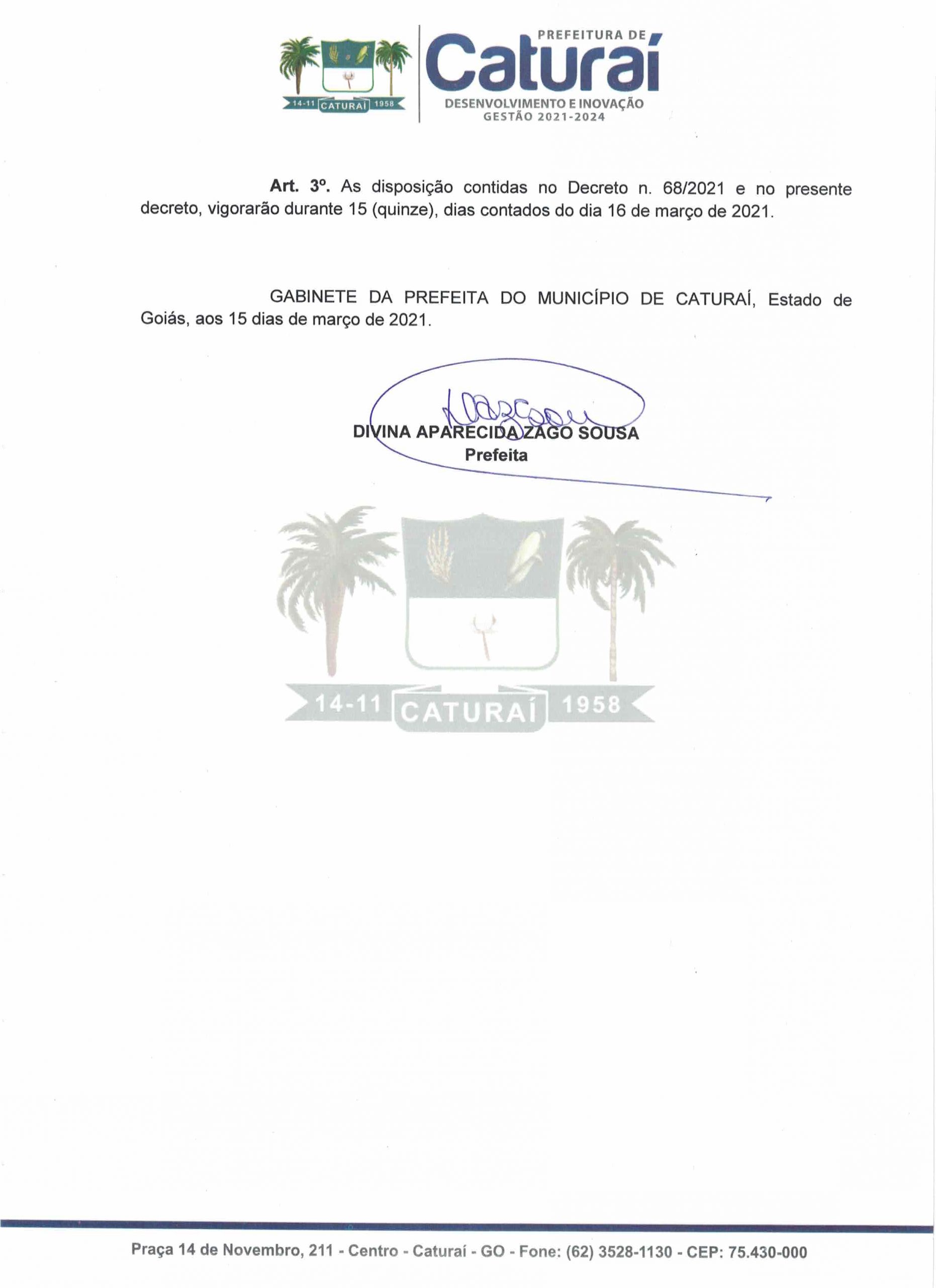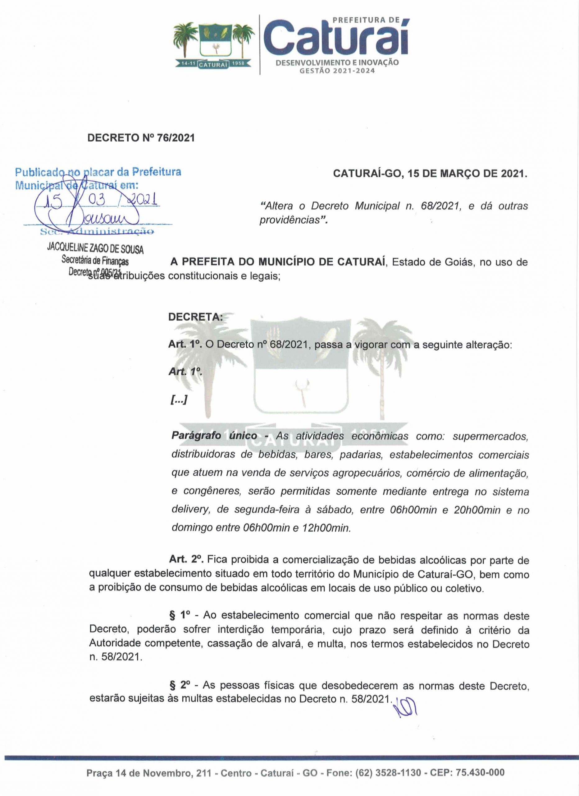 A Prefeitura de Caturaí publicou nesta segunda-feira, 15, o Decreto Municipal nº 076/2021, que altera o Decreto Municipal nº 068/2021 e dá outras providências em relação a disseminação da pandemia ocasionada pela Covid-19. O decreto entra em vigor nesta terça-feira, 16 de março.