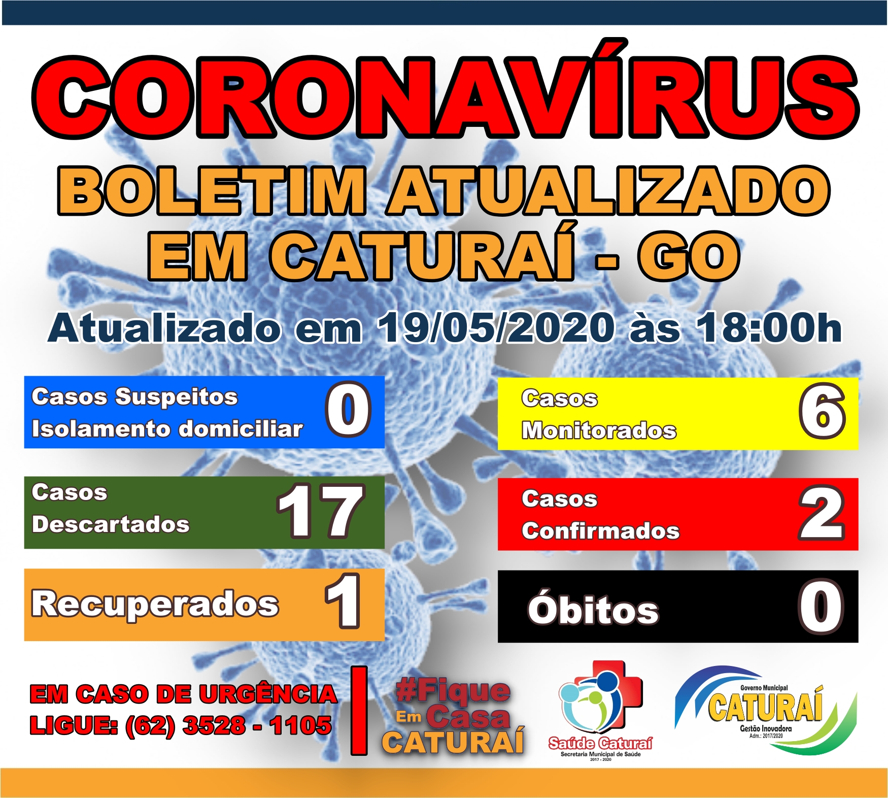 Os órgãos avaliam sistematicamente suspeitas de novos casos no município e todas as informações oficiais sobre a situação de pandemia do Coronavírus em Caturaí, serão divulgadas em nossas redes sociais (Facebook e Instagram) e aqui no site oficial do município. Governo Municipal de Caturaí, uma nova história, escrita por quem ama sua gente!