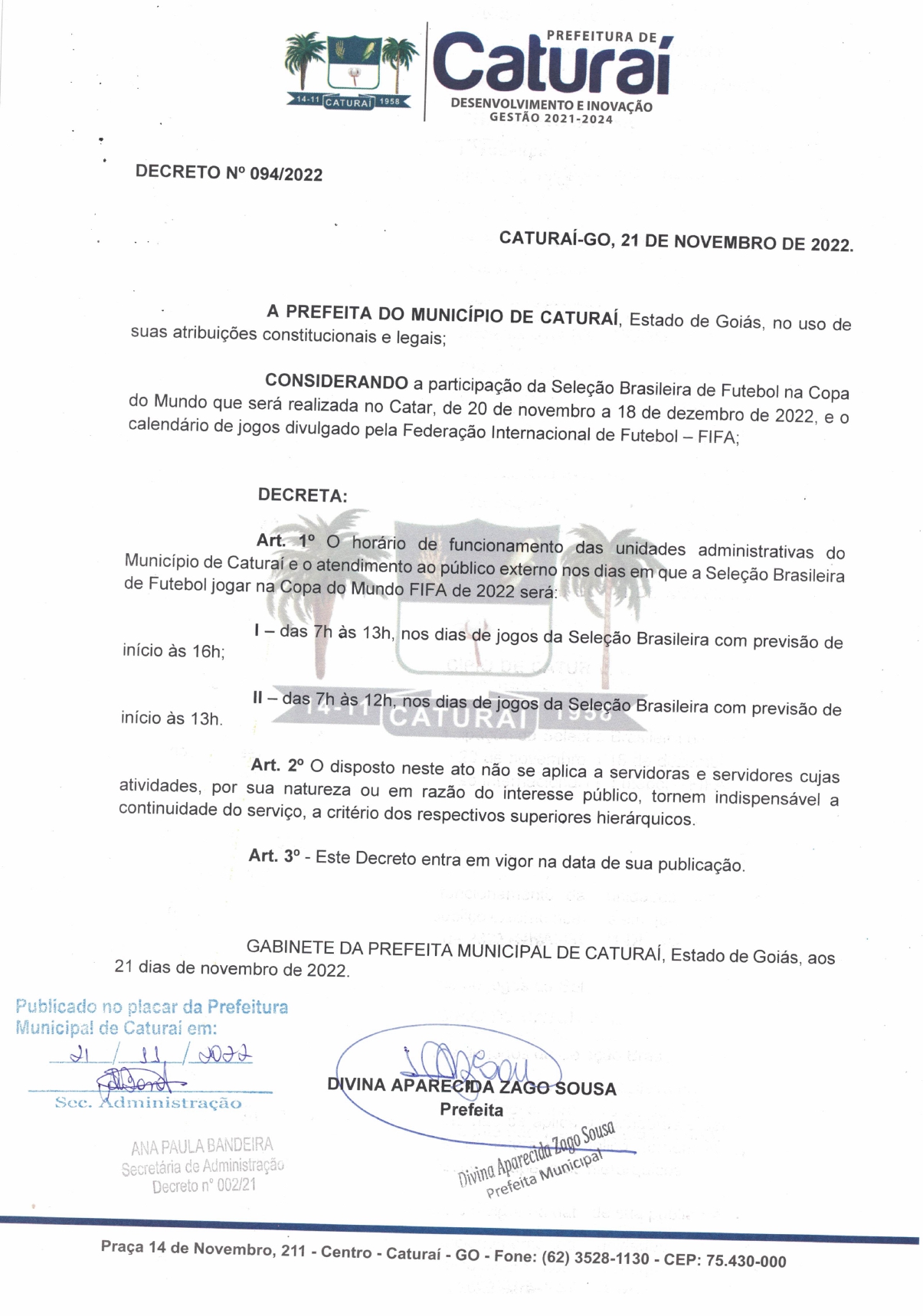 Conforme o Decreto nº 094 de 21 de novembro de 2022, confira como será o expediente nas repartições públicas do município de Caturaí nos dias do jogos da Seleção Brasileira de Futebol: