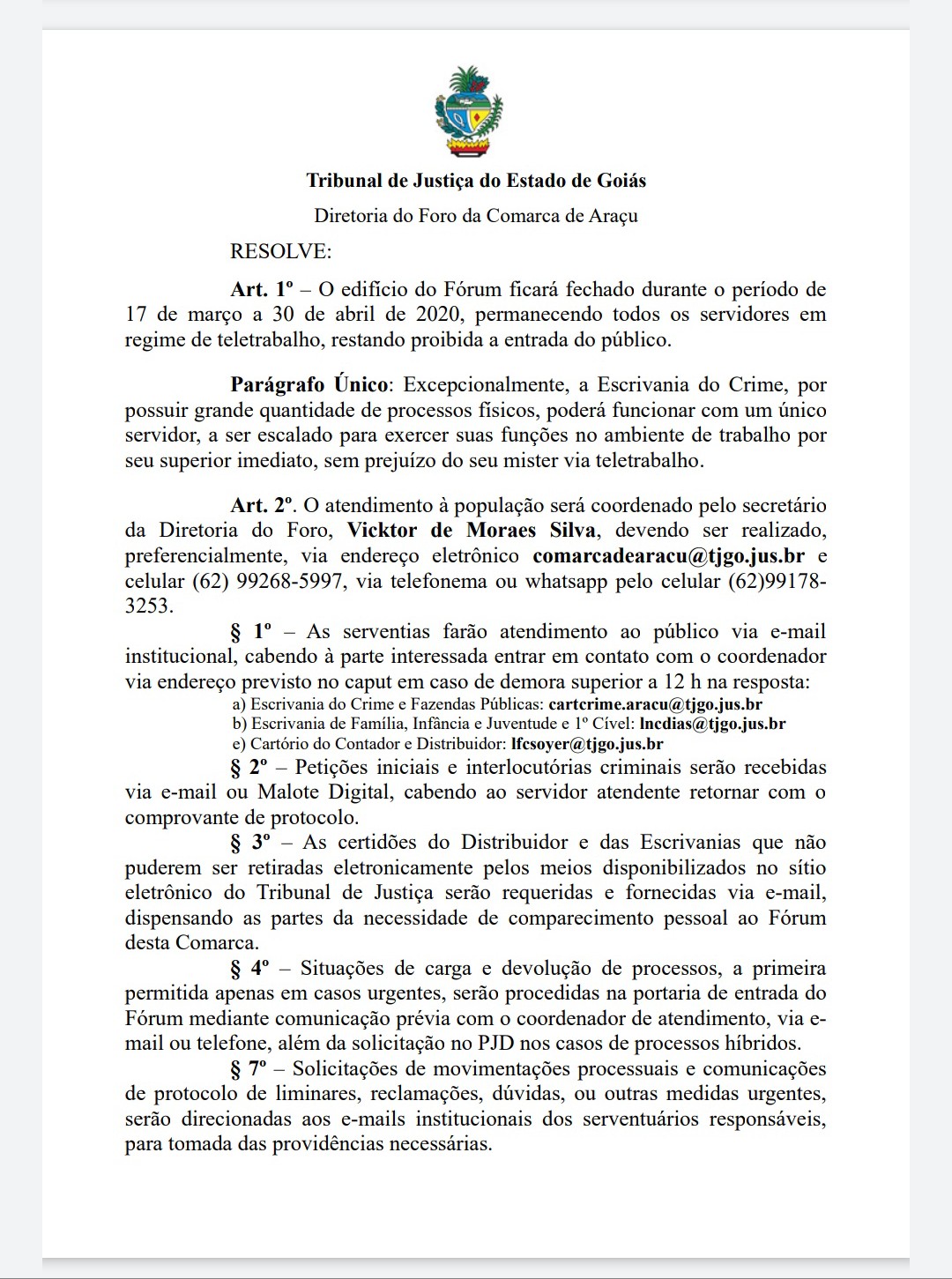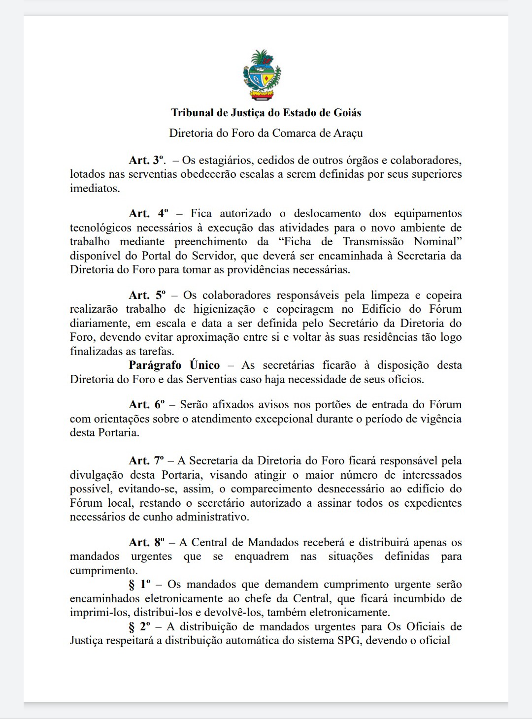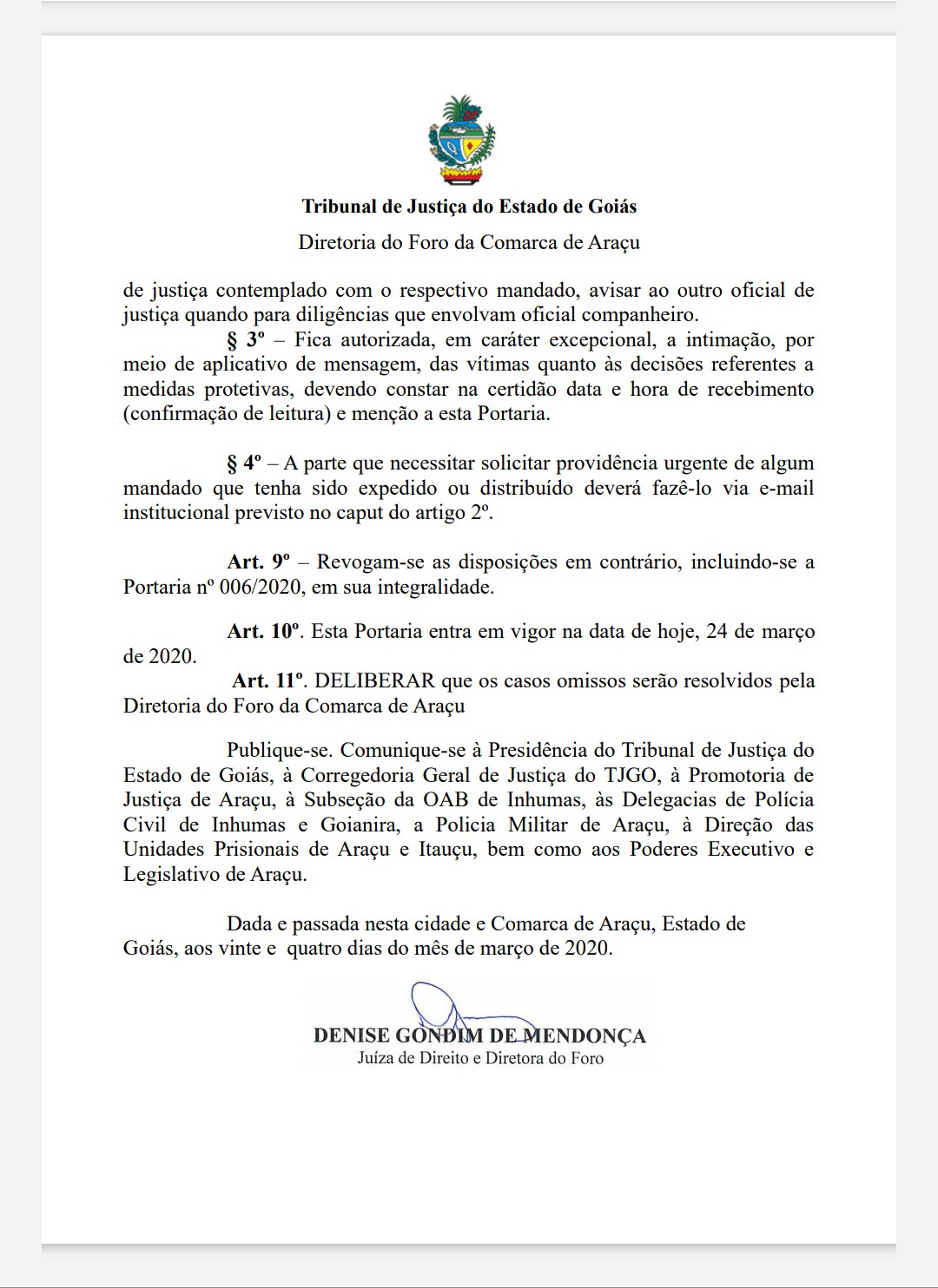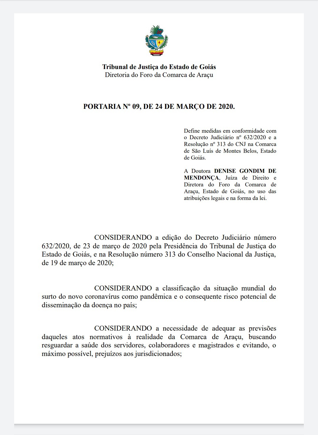A Doutora Denise Gondim De Mendonça, Juíza de Direito e Diretora do Foro da Comarca de Araçu, Estado de Goiás, no uso das atribuições legais e na forma da lei, define medidas em conformidade com o Decreto Judiciário nº 632/2020 e a Resolução nº 313 do CNJ na Comarca de São Luís de Montes Belos, Estado de Goiás, referente a pandemia do Coronavírus.